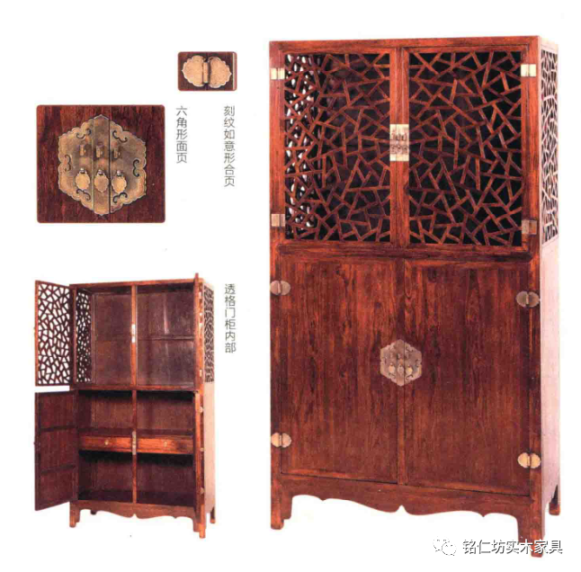 冰綻紋透格門柜,以珍貴木材如黃花梨或紫檀木制同類家具,用途應(yīng)是放置觀賞器物或圖書而不是食物,而透欞亦有較富裝飾性的圖案如現(xiàn)例的冰綻紋或下例的云紋花片等的變化,透出空靈之感。