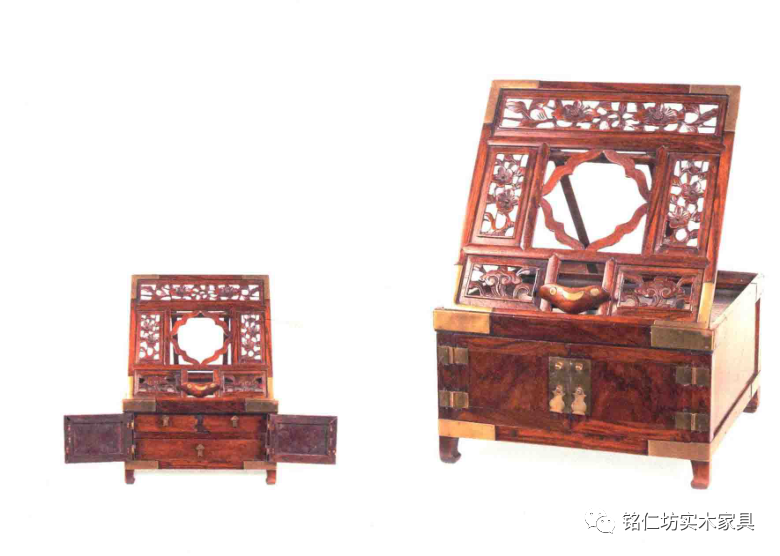 黃花梨折疊式鏡臺,是由鏡架發(fā)展而來的家具。架下增添了臺座,兩開門及內(nèi)設(shè)抽屜。鏡架框內(nèi)三邊嵌裝透雕花紋的絳環(huán)板,正中方格安角牙,下層設(shè)荷葉式托子,可上下移動。