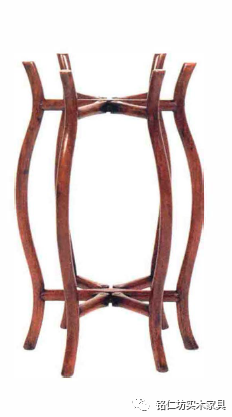 黃花梨六足折疊式矮面盆架,形狀呈“燈籠”狀,圓材六足, 能折疊,但腿足不用直柱,而是每根上下端外翹,中部向外大彎,使六足開啟后成造型優(yōu)美的燈籠形,與上例觀感大異。通體光素,質(zhì)樸無華,意趣古雅。